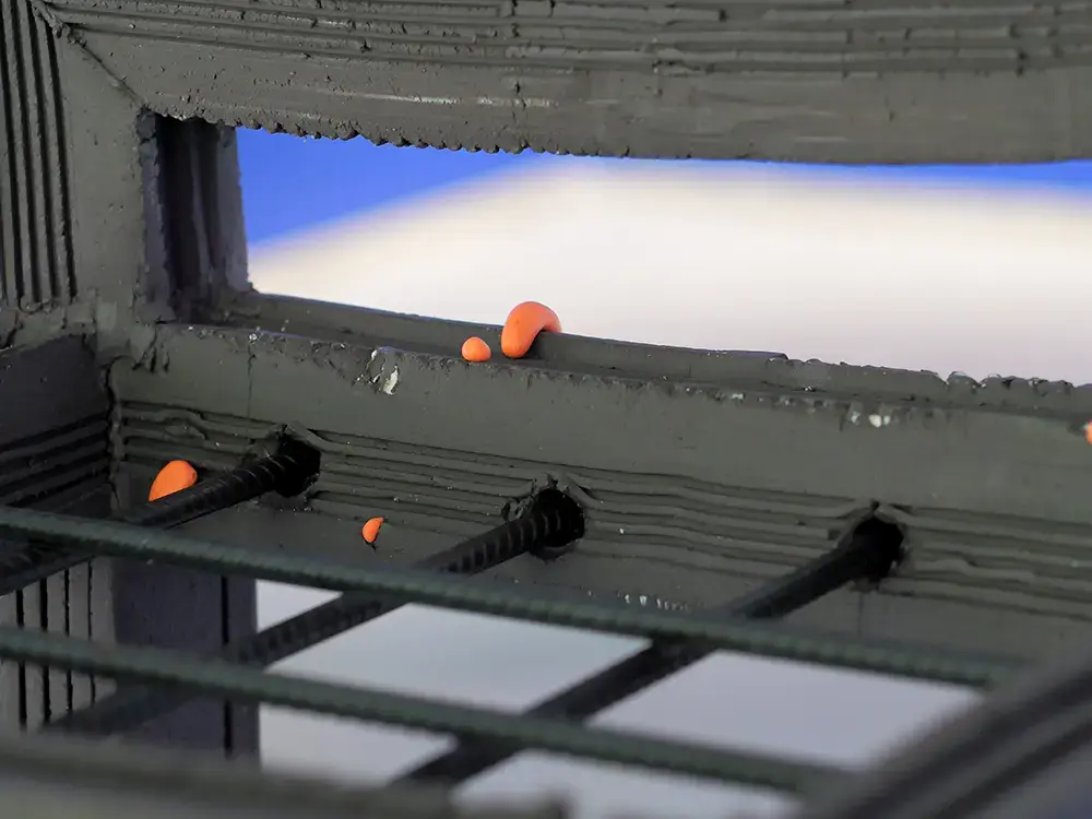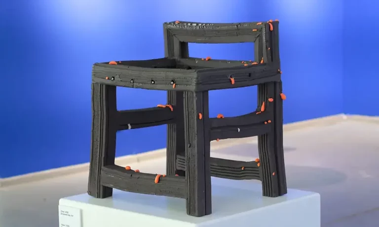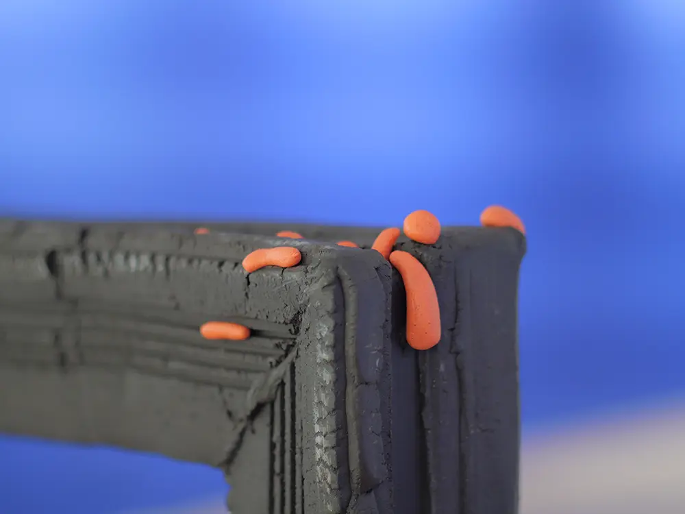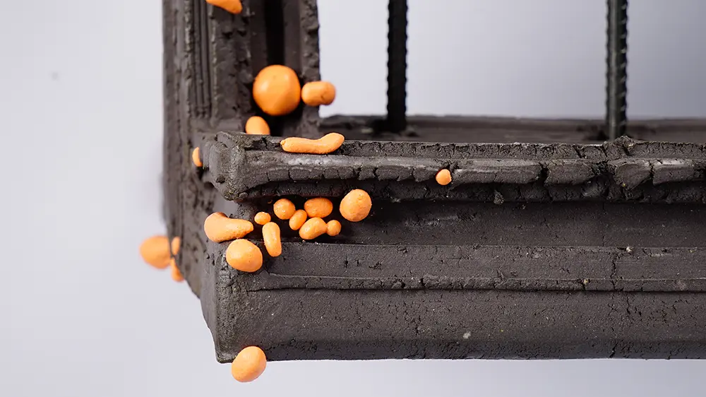 Its austere form and muted color contrast with the emergence of vibrant, organic protrusions that appear almost alive and repulsive. These elements act as a symbol of vitality within an otherwise restrained and somber aesthetic.
